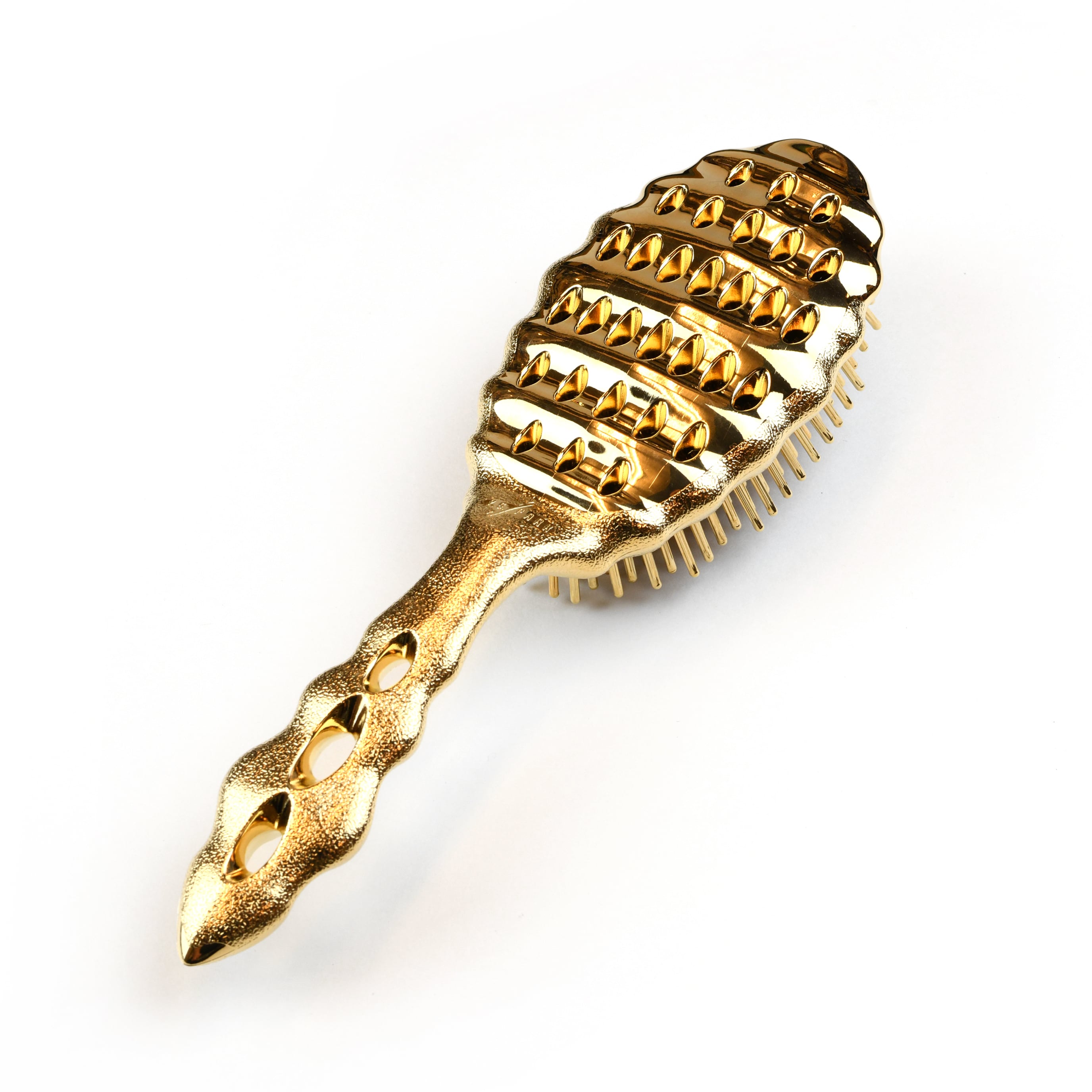 世界初(当社調べ)のメタルメッキピンを使用したヘアブラシ。滑らかな表面加工により髪にワンランク上の艶を与える。角のない丸いピン先で頭皮に優しく、高密度ピンでより艶のある仕上がりに。オールマイティーに使用可能。ゴールドは24K使用。